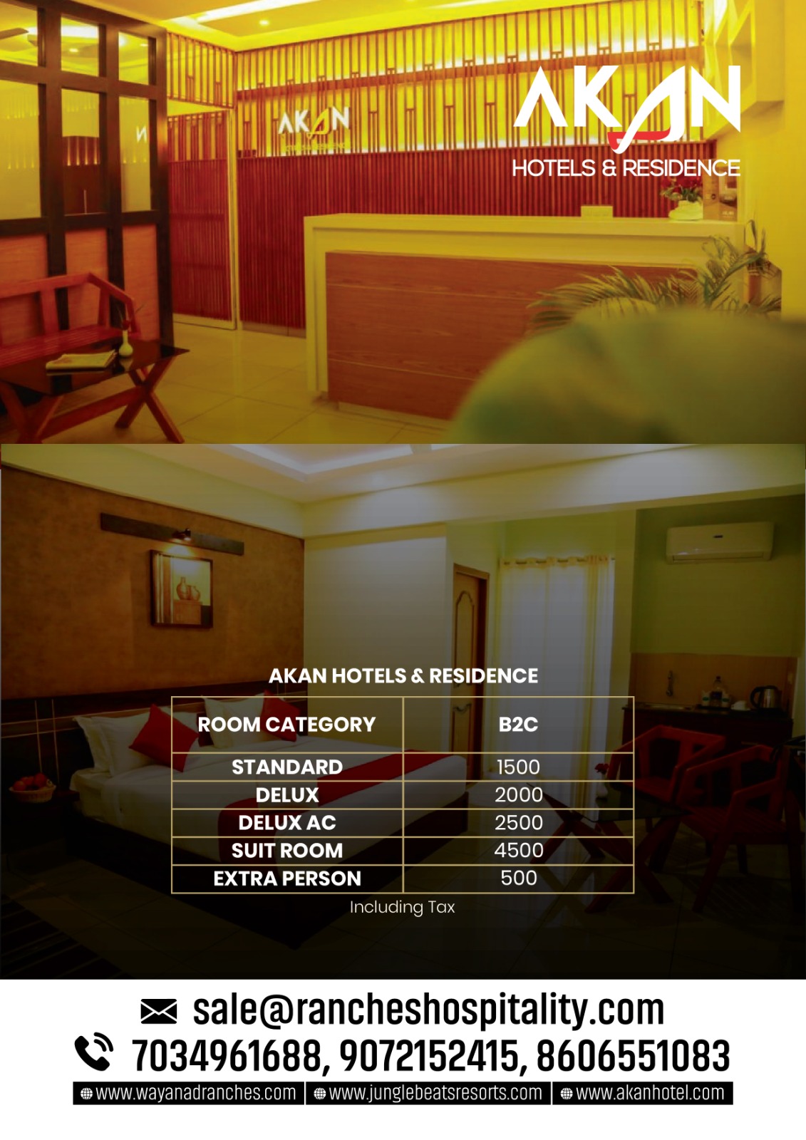 Akan Hotel invites you to indulge in luxury amidst Wayanad's breathtaking scenery. Our elegant accommodations blend modern comforts with traditional charm, offering a perfect haven for discerning travelers. Enjoy impeccable service and exquisite dining experiences as you explore the wonders of Wayanad. Whether you're here for a leisurely holiday or a business retreat, Akan Hotel promises a delightful stay where every moment is crafted to perfection. Experience the epitome of hospitality at Akan Hotel, where your comfort is our utmost priority.